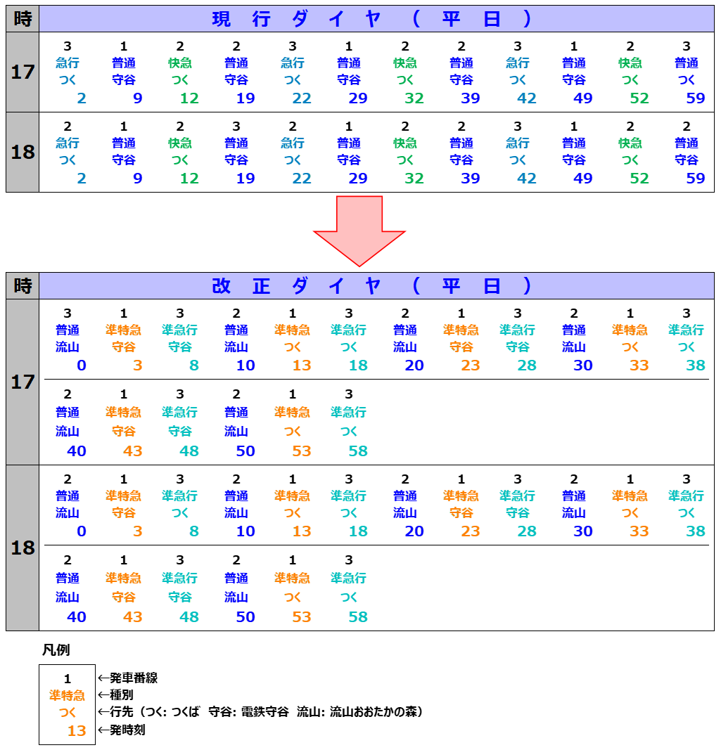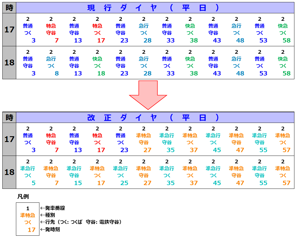 準特急は、つくば線開業時の快速急行と停車駅数が同じ(柏の葉、研究学園を通過していた)であることから、当時と比較すると停車駅リソースが再配分されたともいえる。