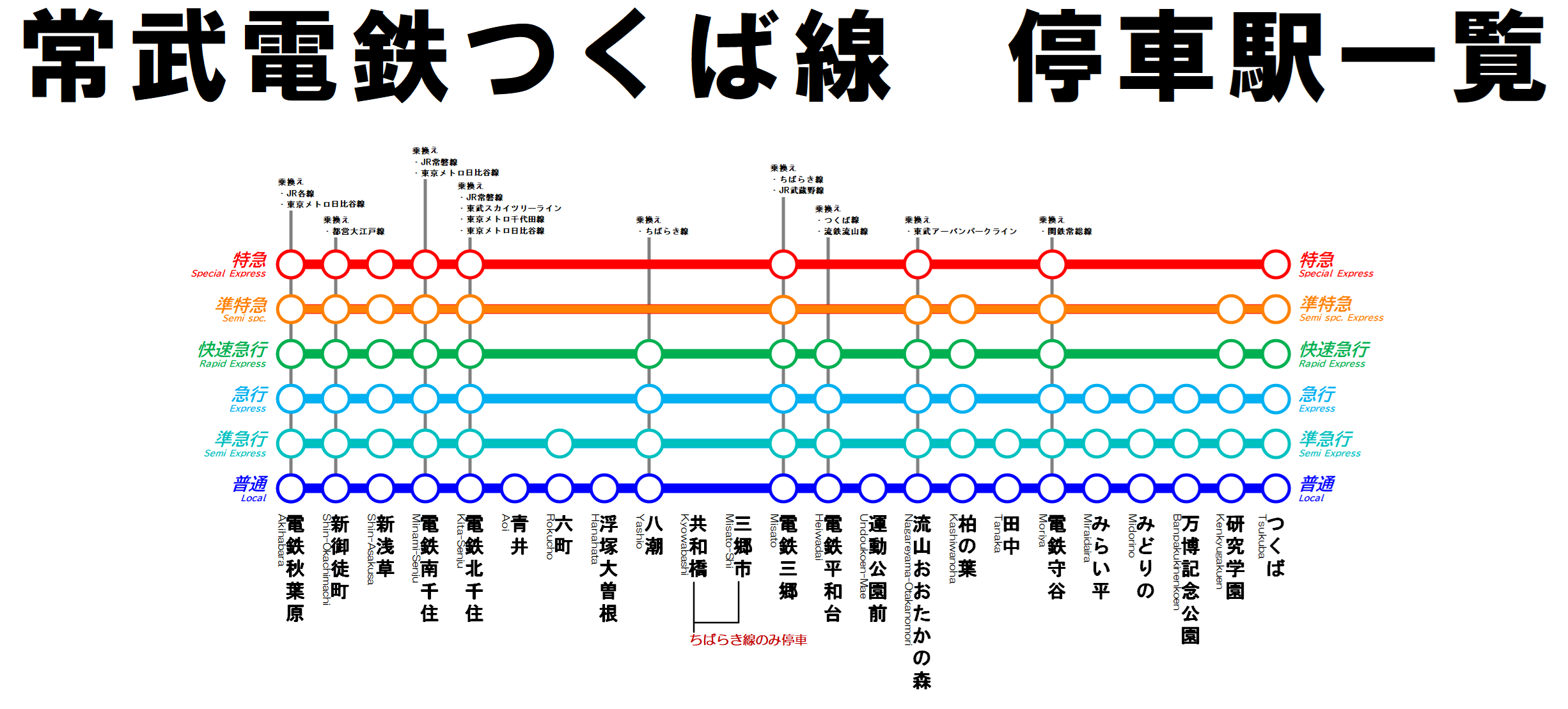 準特急: 電鉄秋葉原―(各駅停車)―電鉄北千住・電鉄三郷・流山おおたかの森・柏の葉・電鉄守谷・研究学園・つくば